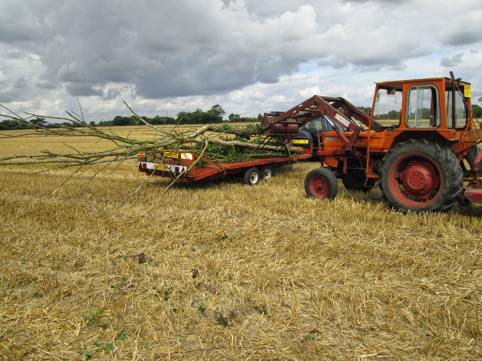 He then took the trailer round onto the field and loaded the trees with the tractor. They've been put up near our bonfire heap so that when we cut the trunks all the small twiggy bits can go straight onto the fire.
