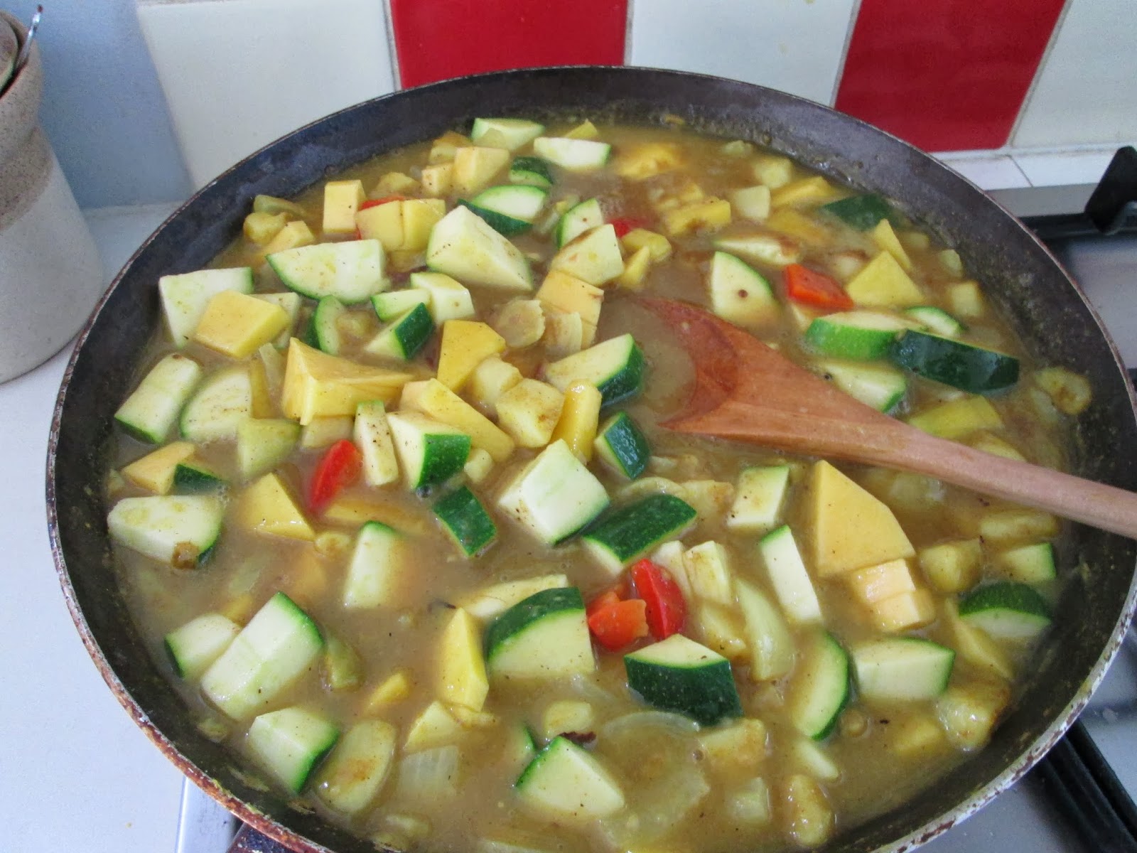 Of all these, our home made veggie curry must be one of the cheapest. We have this about once a fortnight. This curry always starts with an onion and an apple, then depending on the time of year I add courgette, leek, cauliflower, squash or pepper or a combination. In winter or the hungry gap then dried fruit such as prunes and apricots are used or even a banana, with broad beans from the freezer and cooked potato.The other ingredients are a knob of butter, a dessertspoon of curry powder and 3 of flour, a good dollop of any home made fruity chutney, a teaspoon of sugar, black pepper, pinch salt and boiling water.