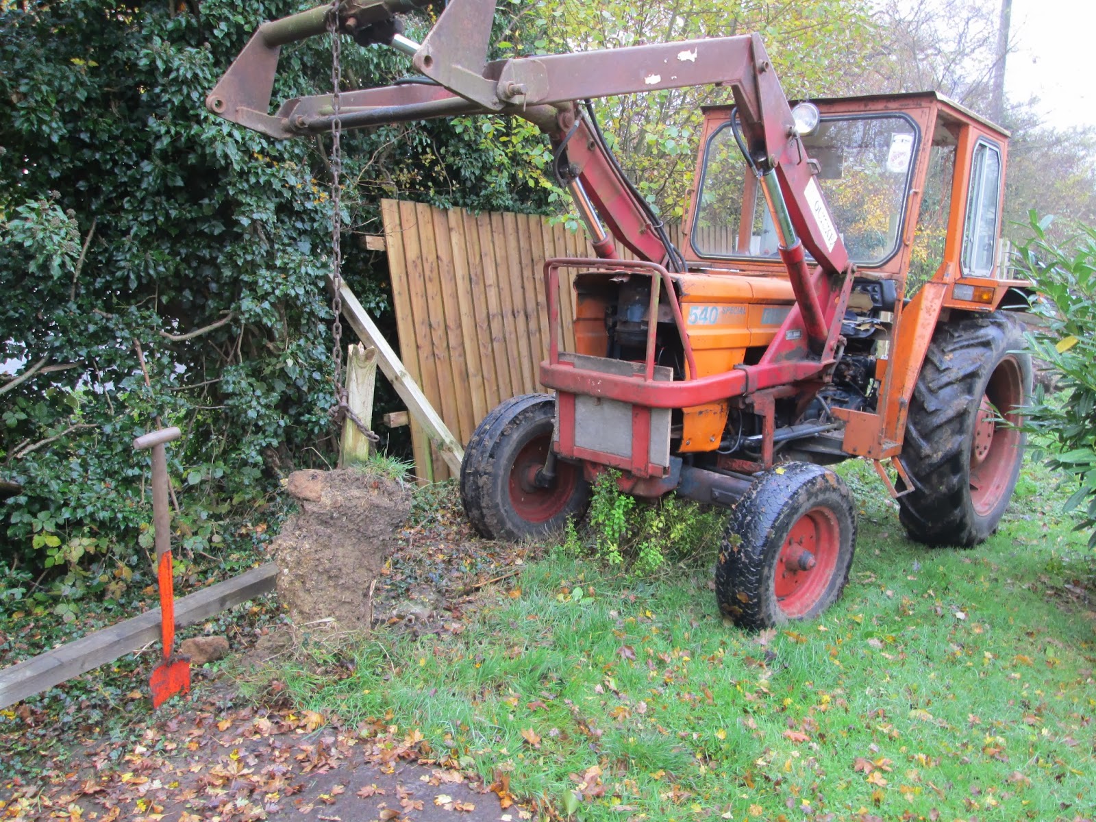 Meanwhile back at home Him Outside was using that tractor to pull the broken posts out of the ground. This fence was only built about 3 years ago yet several of the posts were completely rotten, no wonder that gale a few weeks ago was able to blow the fence right over. With the hydraulics repaired the tractor lifted out the broken post and the concrete bit easily.