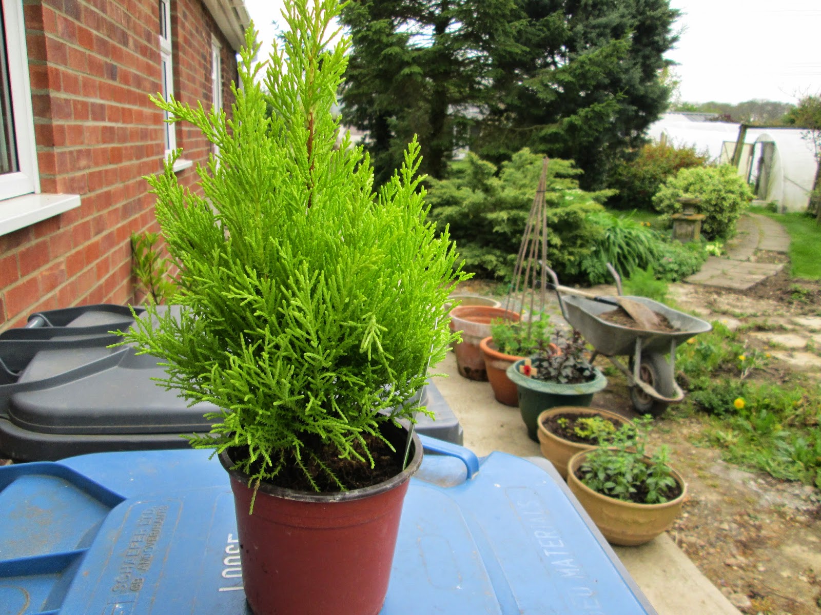 This morning when the sun shone it was warm, when it disappeared behind a cloud it was blinkin' cold. I was shifting a few hyacinth bulbs from the small back garden ( which is going to go back to grass) round to the front border.Also potting up a some more self sown herb seedlings. C.was sorting out the poly tunnel frame and getting the hot-spot tape on the metalwork. We also put the netting over the top of the fruit cage - that's a fun job! it gets caught on every single thing and we spend ages unhooking it.