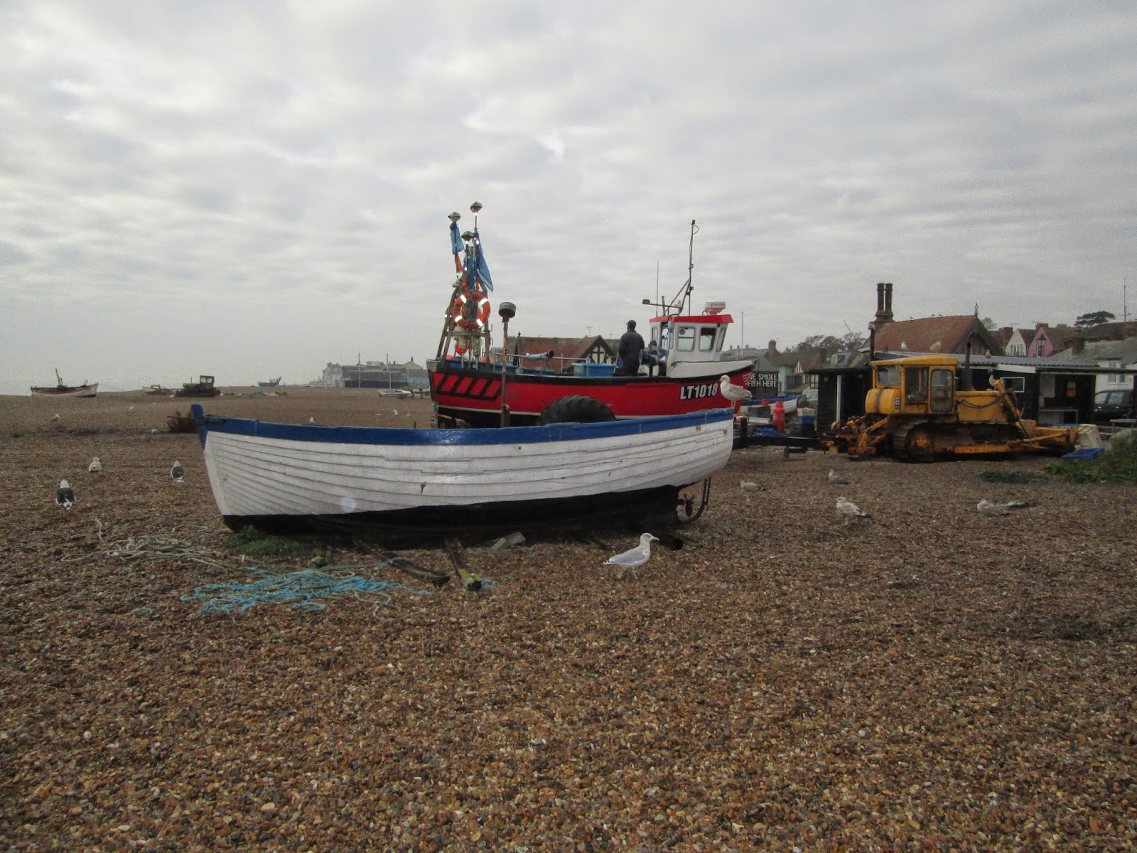 | Aldeburgh has a small fleet of fishing boats - 3 or 4, and the fish is sold from huts on the beach, the boats are towed down the beach by the tractors or rolled on rollers. |