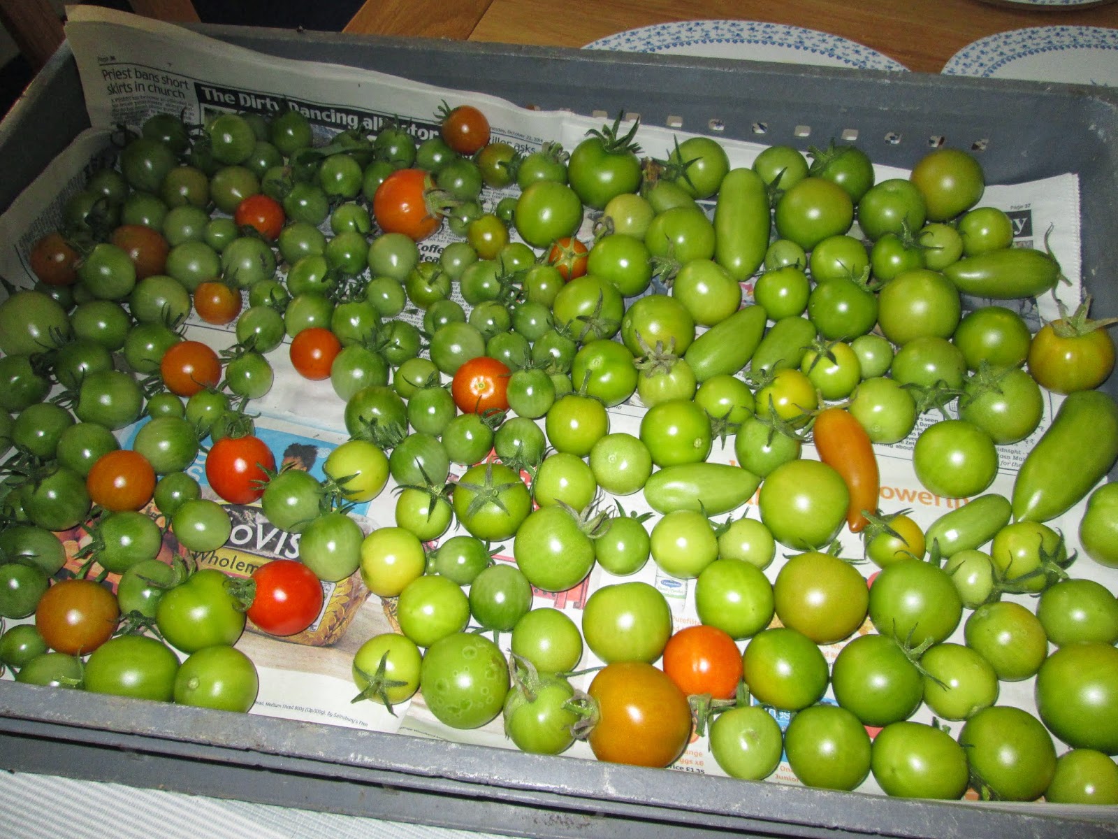 Much too wet for working in the garden today except for getting in the rest of tomatoes from the poly-tunnels. The red ones into the fridge and the green ones on a tray.