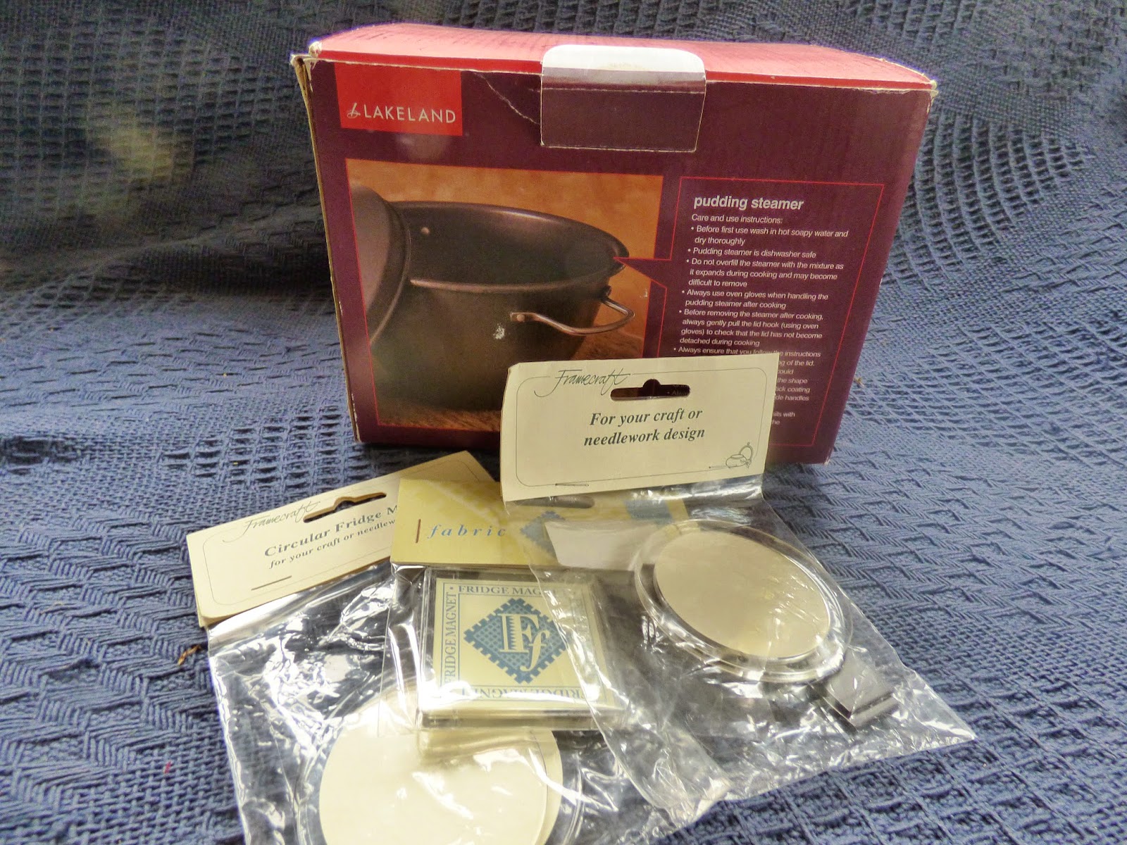 Although I looked round both car boot sales I didn't really see anything very exciting so came home with these on Saturday - a Lakeland pudding steamer for £1.50 and three small frames for making cross stitch fridge magnets - all 3 for 50p.