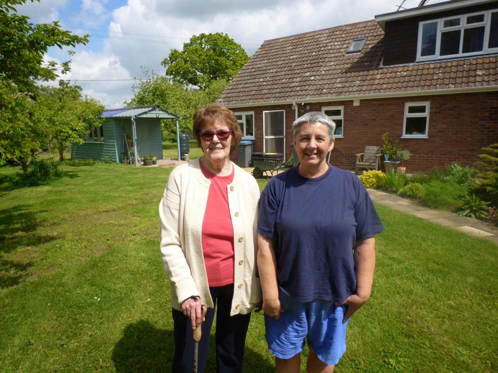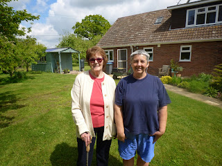 Last week I had a visit from a lovely blogger, well known to many of you out there because she writes so fluently about her life on a Yorkshire farm. Yes, Pat AKA The Weaver of Grass came around with The Farmer for a cuppa while they were on holiday in Aldeburgh. Here we are after a look round the garden, I'm complaining loudly that I'm in baggy shorts and tee-shirt so not dressed for photos, but as John at Going Gently would say"Hey Ho!"